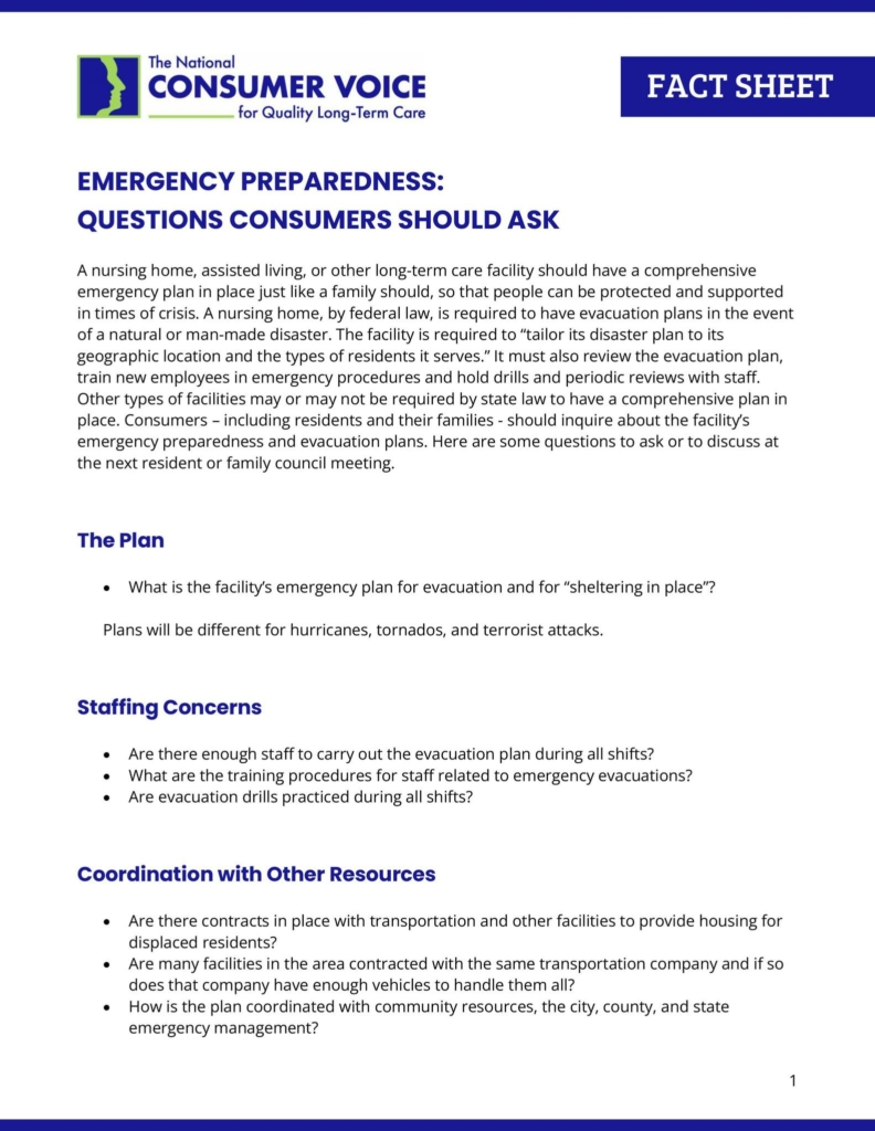 In light of the devastating fire that took place at a Massachusetts Assisted Living Facility last month that claimed the lives of 10 residents, below is an important fact sheet from The National Consumer Voice for Quality Long-Term Care including questions to discuss with a facility regarding emergency preparedness.